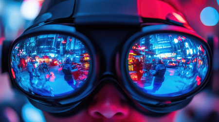 A captivating scene showcasing a city skyline reflected in stylish goggles. The vibrant neon lights and urban landscape create a mesmerizing atmosphere, capturing the essence of modern nightlife.