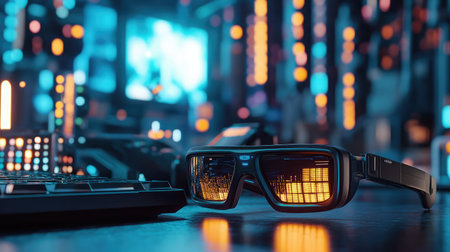 A pair of sleek smart glasses rests on a modern desk with glowing digital displays in the background, showcasing a fusion of technology and innovation in a vibrant environment.