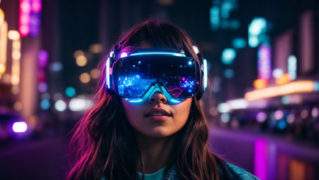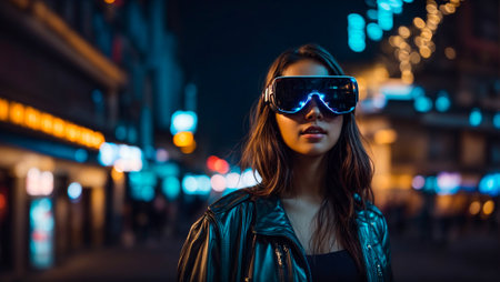 Portrait of a beautiful girl in virtual reality glasses on the street at night