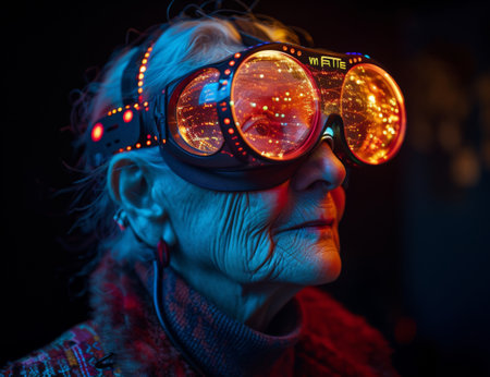Elderly Woman Wearing Illuminated Goggles in the Dark, Concept of Futuristic Technology and Innovation