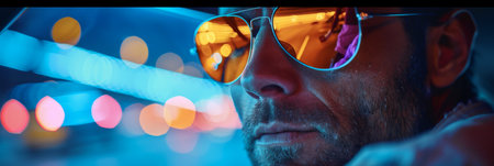 Nighttime City Lights Reflected in Man's Sunglasses.