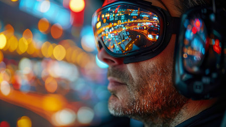 A close-up view of a man wearing advanced virtual reality glasses, showcasing a vibrant digital landscape filled with data and illuminated elements, reflecting innovation and technology.