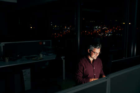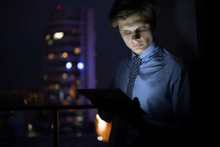 Businessman using his digital tablet late at night