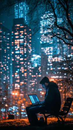 A person sits on a bench in a city park, focused on their laptop. The backdrop features illuminated skyscrapers and a night sky, creating a vibrant urban atmosphere.