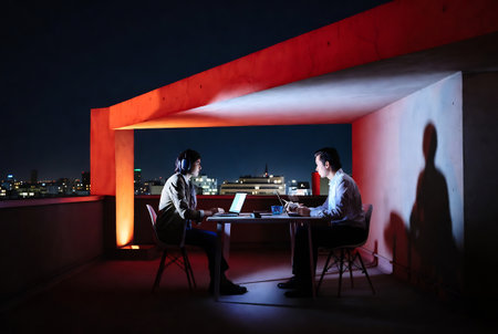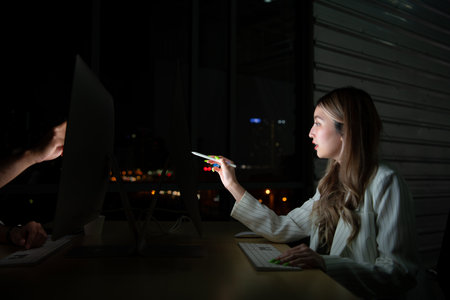 Business professionals collaborating and sharing ideas late into the night to meet project deadlines and drive business growth.