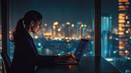 Businesswoman working late at night on a laptop in dimly lit office. Her concentration highlights her productivity and achieving deadlines.