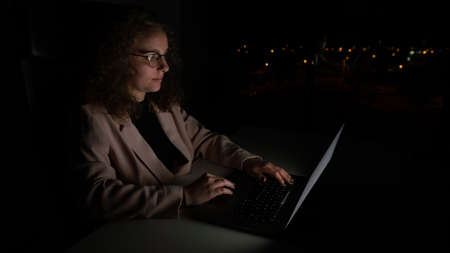 Woman in suit working at night. Concept of overwork in the office, it is dark and there are out of focus lights behind.