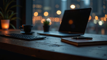 A laptop and coffee cup sit on a table, plants add a natural touch. The background features a blurry cityscape at night with a warm light. The image evokes a sense of relaxation and productivity, suitable for websites, editorial content, and various design projects.