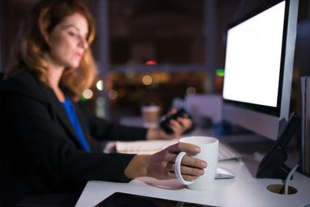 Business lady drinking coffee when working on computer late at night, focus on mug