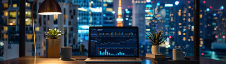 Laptop with Stock Market Data on Desk in City at Night