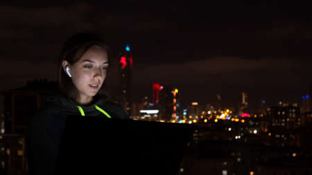 Young woman browsing laptop in night city