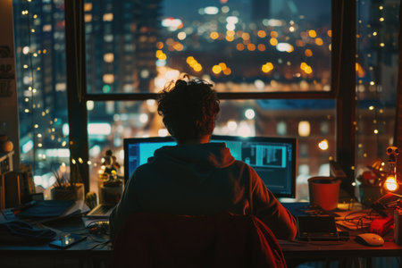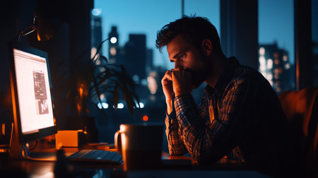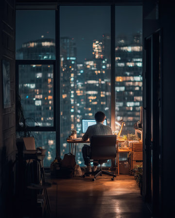 A man focuses intently on his computer screen while working late at night in a city apartment with a view of the skyline