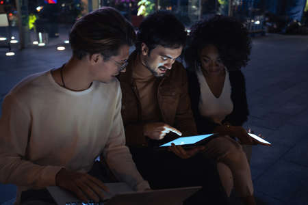 Business people looking at tablet screen and smiling while working at night together