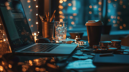 A cozy home office setup with a laptop, coffee cup, and scattered coins on a desk, illuminated by soft ambient lighting, representing finance, work, and comfort.