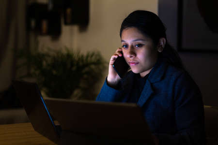 Night shot of a young woman working at home with her computer and tablet. She is talking on the phone