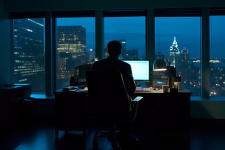 Businessman working late at night in a dark office with city view