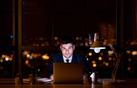 Businessman is sitting at a laptop in a dark office, Working late concept