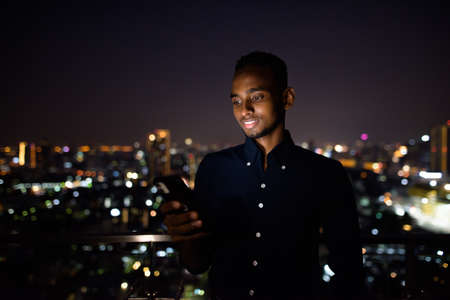 Happy African businessman outdoors at rooftop using phone at night