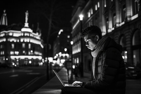 Black man using a laptop in the middle of London. Student or freelancer lifestyle. High quality generative ai