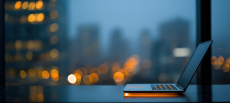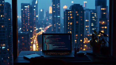 A panoramic view of a city skyline from a high-rise apartment, with a sleek desk setup including a laptop and notepad, symbolizing urban remote work