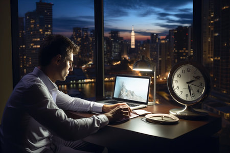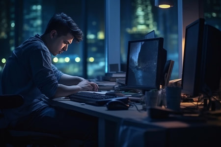 A man working over time at night workplace, generate with AI. High quality photo