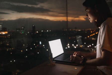 Asian woman work with laptop by the windows apartment with evening city view.