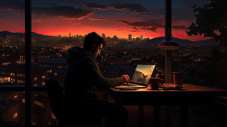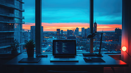 A serene remote work scene showcases an individual at a desk overlooking a stunning cityscape at dusk, blending productivity with urban beauty.