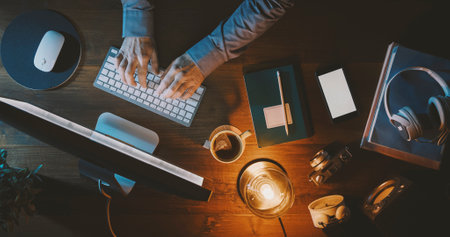 A modern workspace scene features a laptop, steaming cup of coffee, and a phone resting on a wooden desk. The dim light casts a cozy ambiance as a hand types on the keyboard. This image captures a work and study concept, ideal for illustrating business, freelance, and online content. It highlights the integration of technology into a contemporary lifestyle. Perfect for articles or websites related to remote working, home offices, or digital communication. Capture the essence of a morning break with this creative composition.
