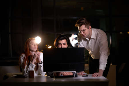 Group of young confident business colleagues in team discussing startup project at night. tired sleepy Caucasian Business People with pc computer working late,brainstorm concept. Copy space