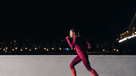 Dynamic photo of a female runner wearing stylish sportswear running at night. Running woman
