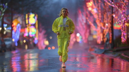A woman in a bright yellow outfit jogs down a rain-slicked street filled with colorful lights, showing the lively atmosphere of the city at night.