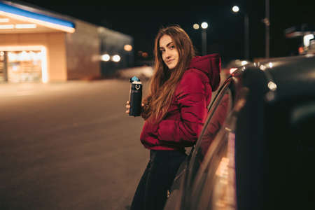 Portrait of woman driver holding thermo bottle leaning on car at gas station, night time