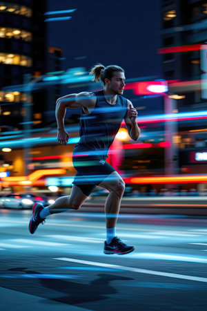 A dynamic image of a male runner in motion at night, capturing the vibrancy of city lights and the essence of urban fitness. The runner exemplifies energy and determination.