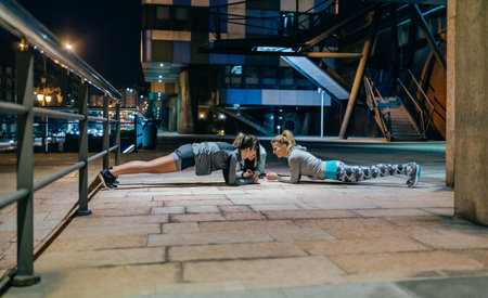 Young women friends sport team having fun while doing plank exercise during training together on the empty city at night
