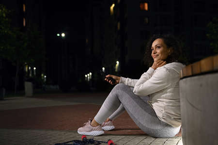 Side full length portrait of beautiful Hispanic woman enjoying relaxation after evening workout sitting on the ground with mobile phone in hand and looking to the side
