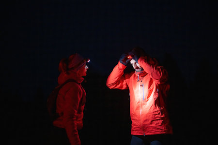 Exploring the Night Forest.Couple equipped with headlamps explore a forest in total darkness, with beams of light cutting through the night air.