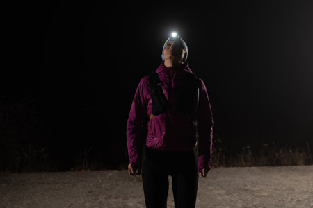 Woman Jogging at Night with Headlamp.Woman jogging at night with headlamp on, captured in dark outdoor environment.