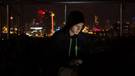 Man in hoodie hacking website at night