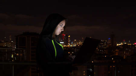 Young woman browsing laptop in night city
