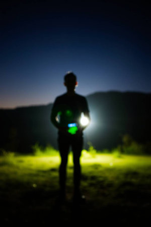 Blurred silhouette of a man holding a flashlight in his hand.