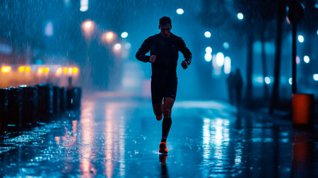 Male runner running while raining at night