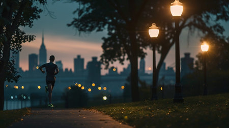 A lone runner silhouetted against a breathtaking cityscape at twilight. The soft glow of streetlights guides their path, embodying dedication to health and fitness in a serene urban landscape.