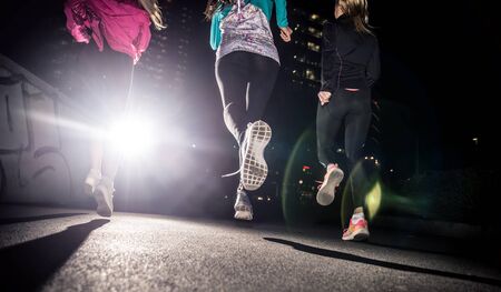 Three women running in the night in the city center