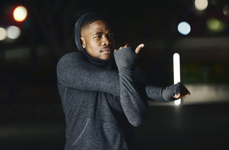 Black man, stretching arms or night fitness in city workout or training exercise in healthcare, cardiovascular wellness or body muscle growth. Runner, sports athlete or person warm up in late evening
