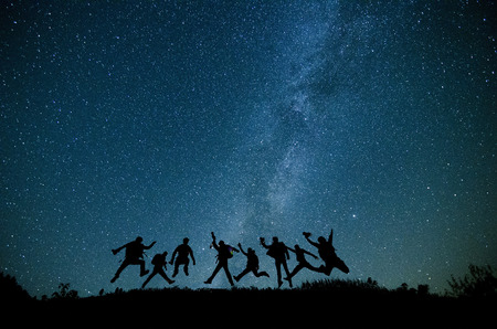 Happy young friends jumping under starry sky, night sky with amazing stars.