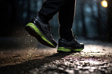 Close up of sport shoes running on wet asphalt road at night.