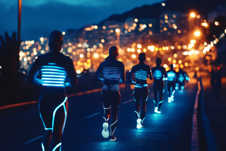 Group of athletes run at night wearing illuminated neon suits on a city street, creating a futuristic and cinematic atmosphere