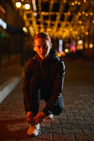 beautiful redhead woman athlete tying laces on street. Runner tying running shoes while running in night city. Caucasian Female is preparing for cardio training outdoor, in sportive outfit, alone