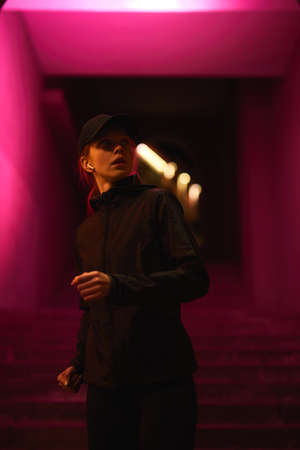 Active calm confident female in headphones and black cap walking running outdoors, looking at side while going in underground crossing, alone. at night. copy space. people lifestyle concept
