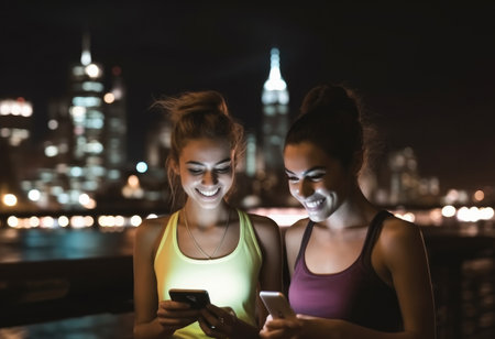 Happy beautiful female friends using smartphone while standing on street at night.